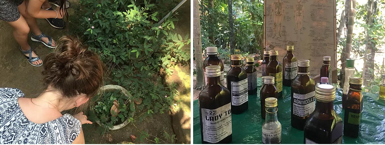 På vejen besøgte vi en af de hundredevis Spice Gardens, der findes i området. De fleste haver er offentlige besøgshaver, hvor man kan få en gratis guidet tur. Dog forventes det, at man giver drikkepenge, og også gerne at man køber noget fra den tilhørende butik. Ayurveda går hånd i hånd med Trancendental meditation, som også dyrkes i udbredt stil i Sri Lanka. Ayurvedisk lægevidenskab bygger på urter og naturmedicin og har 2 formål. At forebygge og helbrede, alene med brug af urter. Ayurveda betyder ”langt liv”. Turen i haven bød på et hav af både kendte og ukendte krydderier og planter, som bruges til at udvinde lægemidler af. Rundturen afsluttedes med urte-the og demonstration af diverse cremer og olier.
