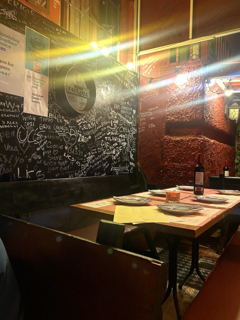 Bedste tapas i Playa del Inglés får du hos Capaco, som du finder på et lille hemmeligt hjørne væk fra turistområdet. På trods af at jeg har været der mange gange, er det ikke lykkedes at få et billede af maden. Så I må nøjes med et tomt bord.