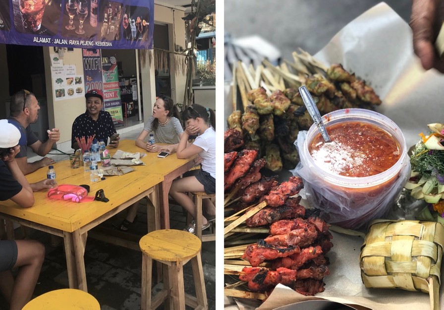 Hvis ovenstående vandfald var turistet, så kom vi i den grad fra asken til ilden senere på dagen. Vi havde forberedt Visnu på, at han gerne måtte finde et sted, hvor vi kunne få gode satay (spyd) til frokost. Midt i ingenting i en lille landsby gjorde vi stop og fik både spyd, riskager og fried rice. Det første smagte så som så (de stegte ris var gode!), men Vishnu havde en fest over, at vi synes, det var stærkt.