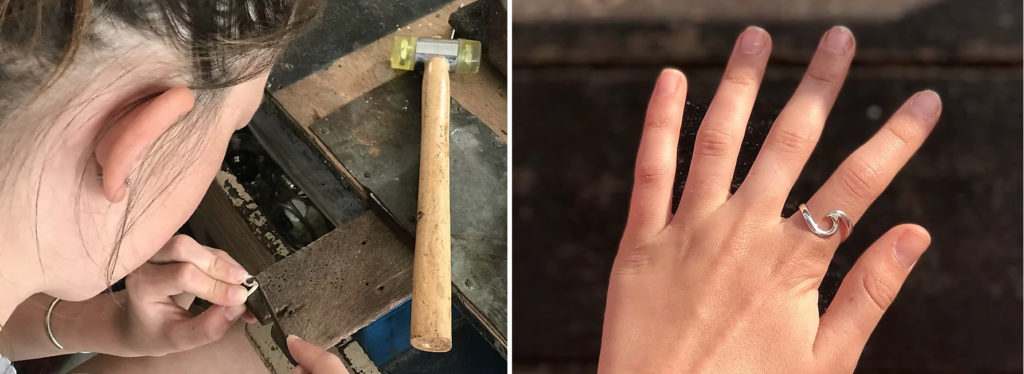 At få lov at prøve hele processen fra at smelte og banke sølvet til formgivning, tilfiling og polering har kun give hende mere blod på tanden ift. et fremtidigt job. Og den smukke ring på pegefingeren er allerede blevet beundret mange gange til ordene: “Den er så fin, og ligesom jeg drømte om”.