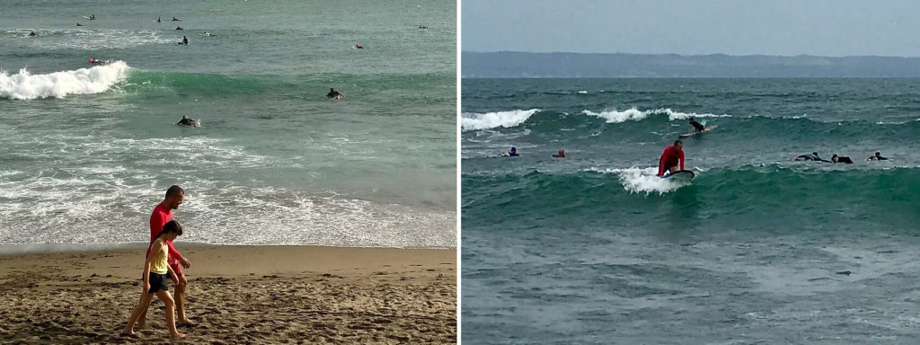 Mens Camille var på workshop, besluttede Jørgen sig for at tage en Surf-lesson. Eftersom jeg var trafikminister, og skulle hente og bringe Camille, var jeg desværre ikke på pletten, da han efter sigende kom helt op på boardet, så I må nøjes med nedenstående snapshot på knæ.