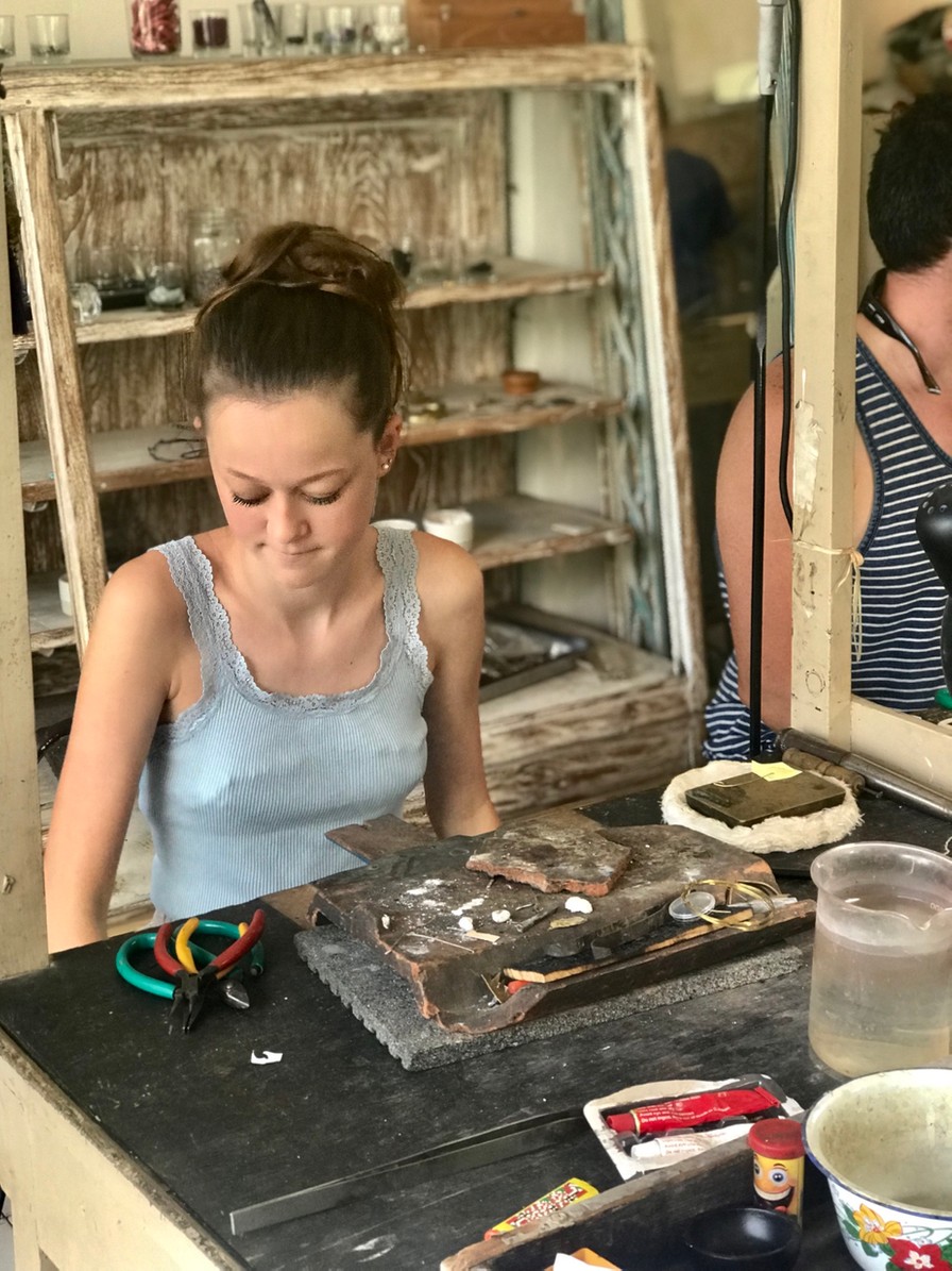 Camille drømmer om engang at blive guldsmed, og da vi så, at man her i byen, kan komme på workshop hos en sølvsmed, var hun ikke længe om at hoppe med på ideen. Hun har haft en fantastisk halv dag på deres værksted, og lavet den fineste ring med en bølge fra Bali på.