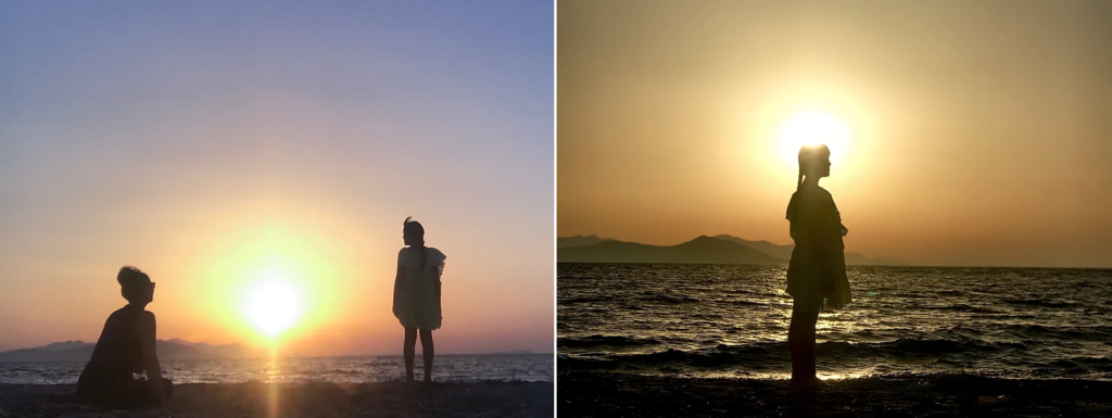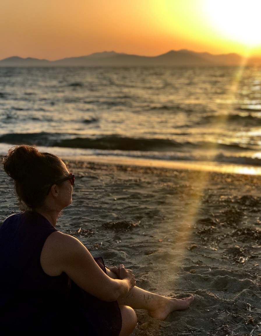 Her er hverken barer eller cafeer, så fyld cykelkurven med gode drikkevarer og snacks, stik fødderne i sandet og NYD sceneriet. Her går solen ned bag naboen Pserimos, og det er seriøst lige spektakulært hver aften, og betagende som farverne skifter minut for minut. Også i går, hvor Selma og jeg havde det så sjovt med selvudløseren på kameraet.