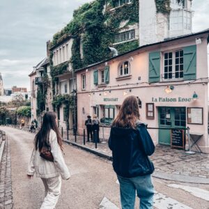 Måske den mest fotograferede cafe i Paris. Cafeen ligger for enden af Rue de l’abreuvoir (se nedenfor) og meget tæt ved Sacre-Coeur, så du kan med fordel nappe alle 3 locations på samme tur. Nedenfor ses Mindy og Emily foran den yndige lyserøde cafe, hvor vi opgav at få et bord.
