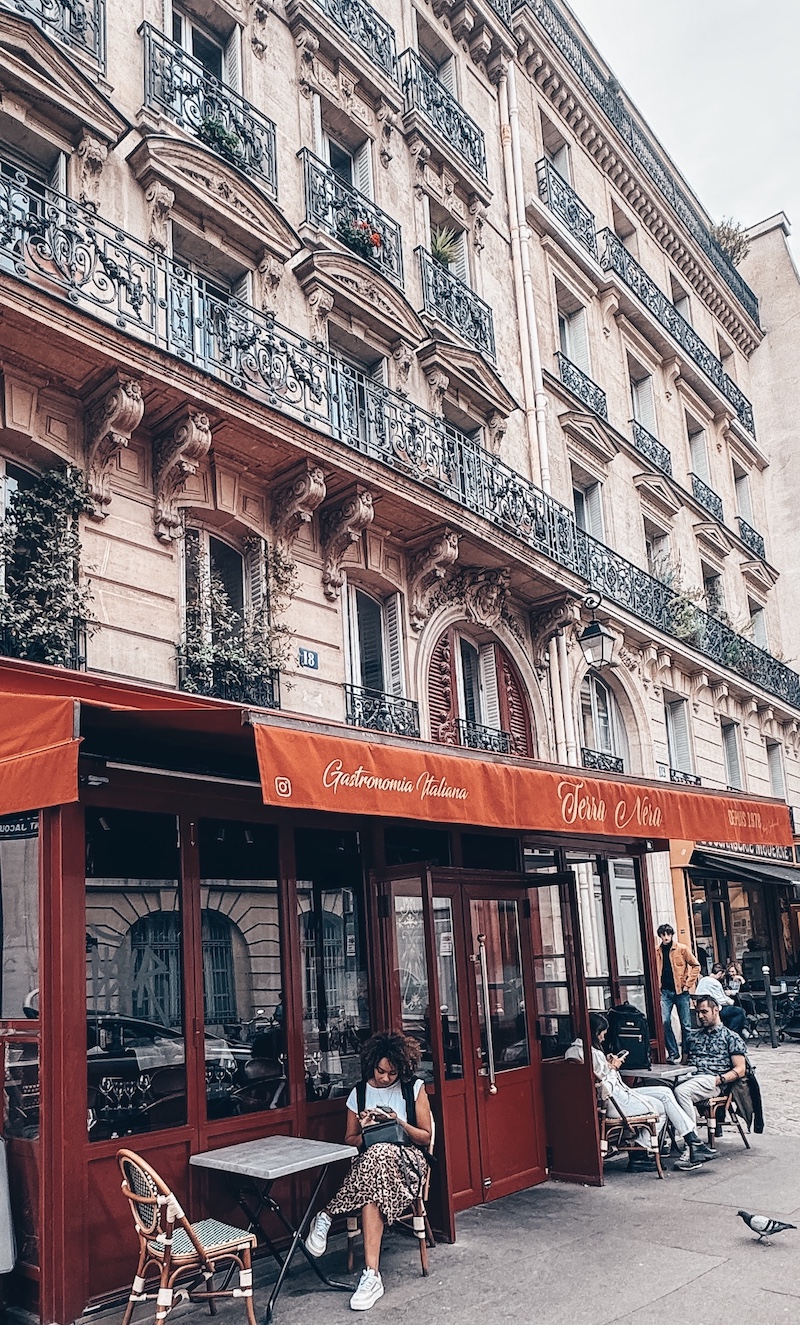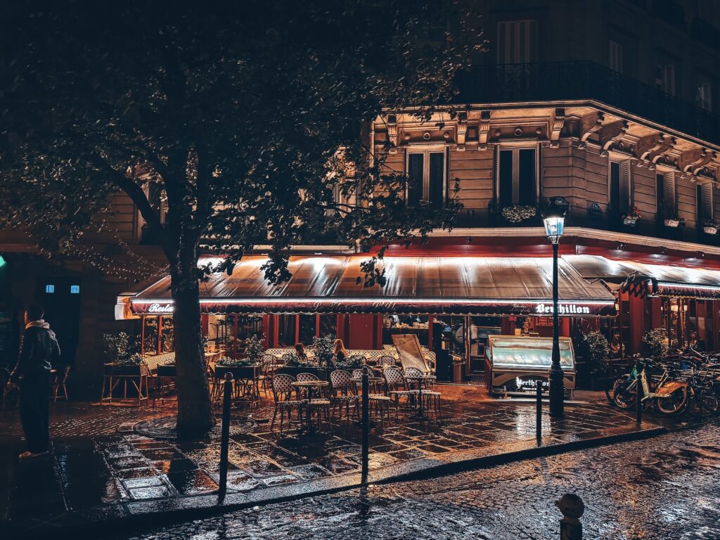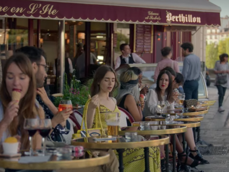 Den franske bistro ligger på pladsen lige overfor Emilys lejlighed i 5. arrondissement i Latinerkvarteret. Lige ved siden af – det spottes svagt i baggrunden på billedet, ligger bageriet, hvor Emily lærer, hvordan hun udtaler “Pain au Chocolate”.