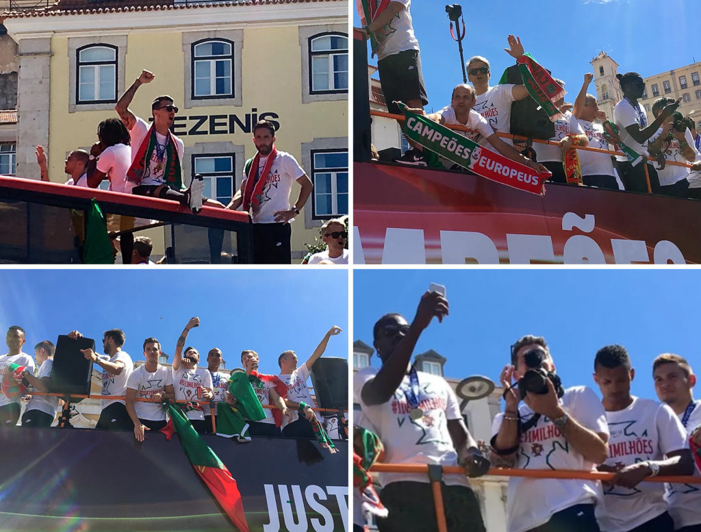 Portugal vinder EM, mens vi er i landet og bliver modtaget som de mestre de er lige der, hvor vi befinder os i Lissabon. Jeg havde end ikke skænket scenariet en tanke, da jeg bookede ferien. Vi er simpelthen både heldige og privilegerede at få lov at opleve dette. Lige over middag, mens vi spise frokost (tilforladelig sushi), fik vi helt tilfældigt spottet på en tv-skærm, at alle spillerne blev hyldet i området Belem lige i udkanten af Lissabon. Vi kunne tyde os frem til, at det der stod i bunden af skærmen lignede en række adresser og dermed en rute, og pludselig så vi dem springe op i en dobbeltdækker. Så var det om at finde internet og få googlet de adresser, vi havde opsnappet og finde en plads et sted på ruten.
