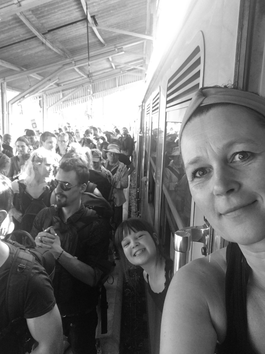 Og således drog vi fulde af fortrøstning afsted til Nano Oya (stationen nærmest Nuwara Eliya) for at køre med middagstoget, som er dagens største tog med 10 vogne. Med 5 billetter i hus til den nette sum af 550 Rupies (22 kr.) var vi klar. Og så ventede vi ellers. Startende med en forsinkelse på næsten 2 timer, førend den blå slange af et tog med 10 togvogne endelig hylede i det fjerne og gjorde sin længe ventede entré på perronen. Der var sort af mennesker, og ud af det blå opstod nærmest krigslignende tilstande. Folk masede og moslede for at komme ind i toget, der tydeligvis allerede ved ankomst var mere end fyldt. De få der skulle af fik ingen plads, og stemingen var decideret ubehagelig. Særligt Selma var ret betrygget, og da vi endelig kom ind og stod i togets mellemgang, blev det kun værre. Alle maste og særligt børnene havde kummerlige forhold blandt tasker, kæmpe rygsække og poser. Turister af værste skuffe, der bare skulle frem frem frem. Selvom folk nærmest var ved at falde ud på modsatte side af toget, stoppede folk fortsat både store rygsække og sig selv ind. Jeg har aldrig oplevet noget lignende.