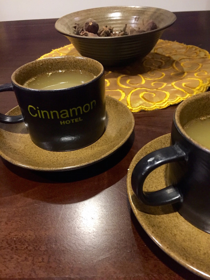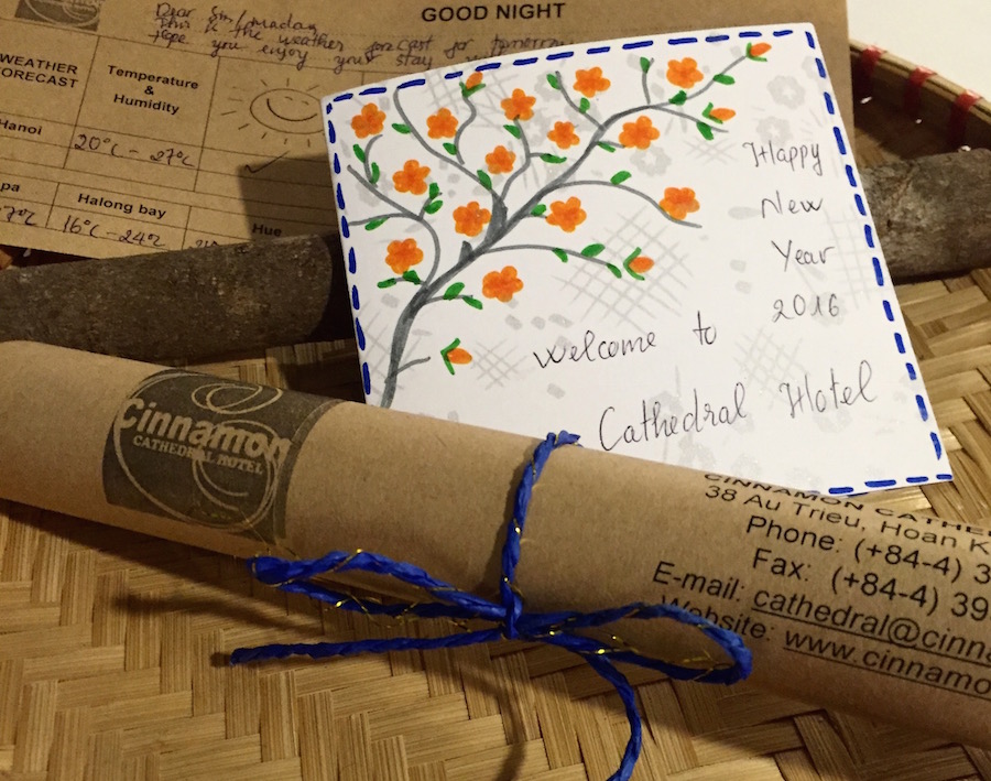 Til gengæld sidder vi nu på det fineste hotel ever i Hanoi. Cinnamon Cathedral Hotel lige mit i byen. Det er det skønneste lille øko-hotel, og vi har fået den mest varme velkomst. Lækker ingefærthe med honning, et skab til vores sko i receptionen (for her skal være rent indendøre), fodmassage til alle (som vi har tilgode) og på værelset var den fineste velkomst i form at det smukkeste håndskrevne kort, en lille godnathistorie og en håndskreven vejrudsigt for i morgen. Fuldstændig gennemført. Vi havde booket 1 dage, men har allerede booket 2 mere.
