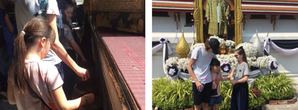 Inden vi tog hjemmefra, nåede Selma lige at fejre 100-dages fest med klassen. En tradition, hvor det fejres, at nu er halvdelen af årets skoledage gået. En noget anderledes 100-dages oplevelse har ramt Thailand. Den 13. oktober 2016 døde landets konge gennem 16 år, og overalt i gaderne og på offentlige bygninger, er der pyntet op med draperinger i sort/hvide farver, kæmpe billeder af den nu afdøde monark og mange steder også store blomsteropsatser. Det er thailandsk skik, at en afdød konge ligger i det royale palads 1 år, førend han kremeres, og de første 100 dage af disse er officiel sørgeperiode. Mange går klædt i sort for at ære ham, og mange vi talte med var tydeligt triste over dette og føler det som et personligt tab. Han var meget vellidt af folket – en ”King for the People”, som vores taxa-chauffør fortalte. De håber og beder til at den nye konge – hans søn på 60 – vil holde samme stil. Den nye konge blev indsat sidste år i december og hyldes også i gaderne med store billeder. Omend vi har en monark i vores land, ligger det alligevel så langt fra vores forhold til folket på Amalienborg. Og som Rasser meget upolitisk udtrykte: ”Når Magrethe dør, tror jeg sgu jeg fester i 100 dage ”(undskyld farmor – vi må arbejde på den opdragelse).