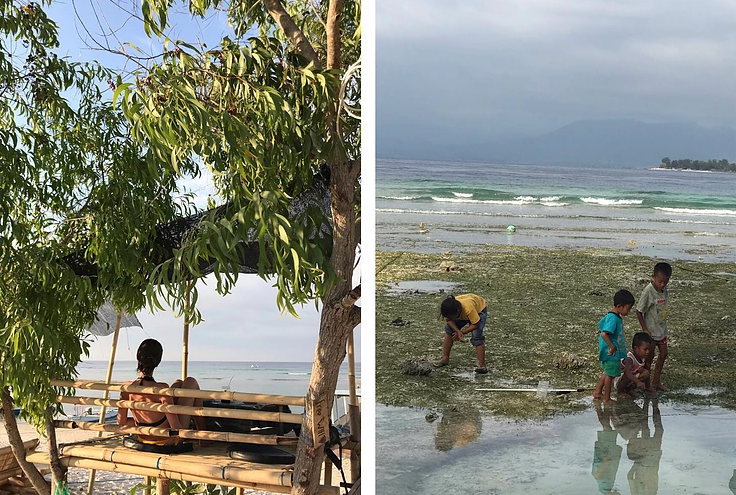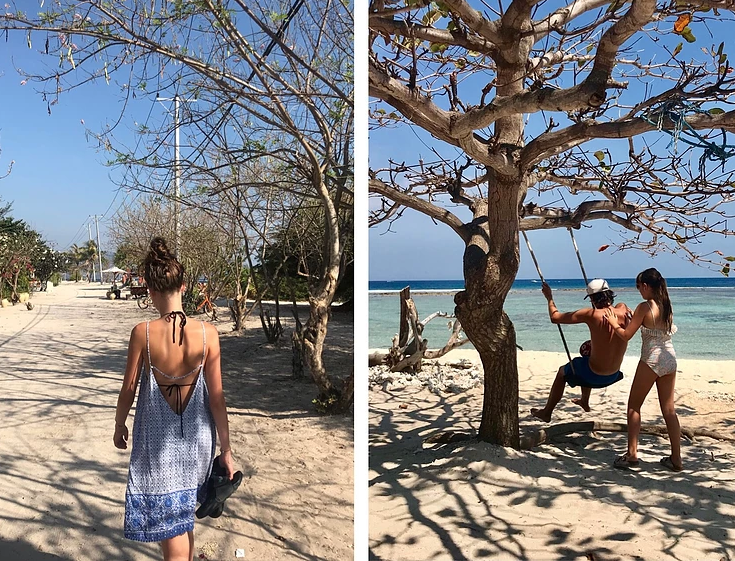 Gili Meno er den mest rolige af de 3 øer, og betegnes ofte som “honeymoon-island”, hvilket vores oplevelser stemte meget godt overens med. Vi mødte i al fald langt flere unge par end børnefamilier. Øen er meget stille, og der er noget længere mellem restauranterne og de fancy cafeer, som man i højere grad finder på Gili Air. Men det gør en absolut ikke mindre attraktiv. For på denne ø finder du lange smukke og helt øde strande, azurblåt og krystalklart vand og de bedste muligheder for at snorkle – endda med garanti for at se smukke fisk helt inde i vandkanten.