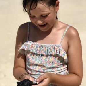 Her er ok at tage en svømmetur men vi fandt nu mest dette stykke strand spændende fordi det er her man finder de største og smukkeste strandskaller. Vi fik TIMEVIS til at gå med at lede, og fandt den ene helt fantastiske musling eller forstenede søpindsvin eller det andet.