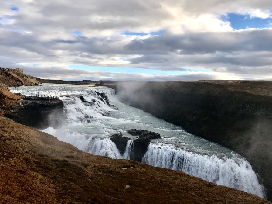 Dagens næste stop bød på endnu en storslået kraftpræstation fra naturens side. Gullfoss er et fredet vandfald med et mesterligt fald på 32 meter. Alle steder føler og hører man naturens kraft. Faldet er så voldsomt og smukt, at det næsten ikke er til at fatte.
