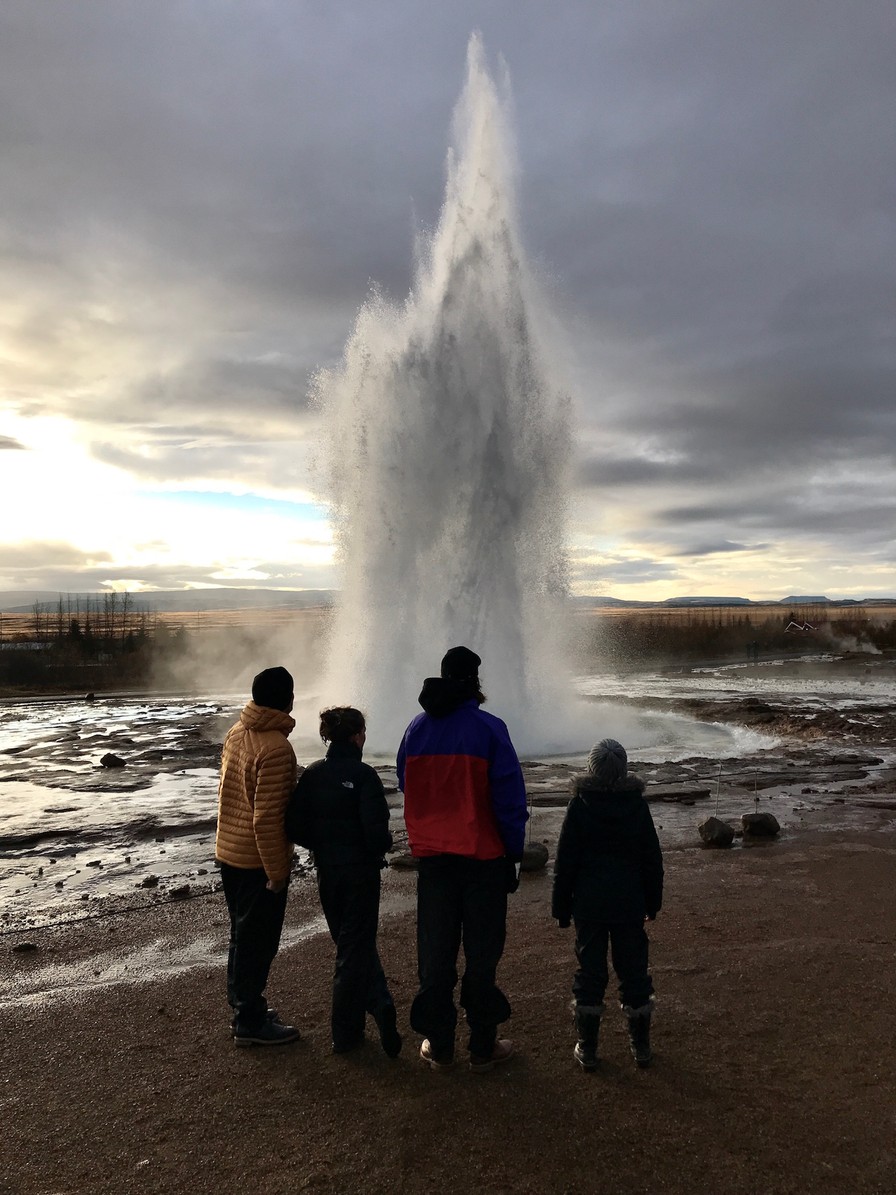 2 timer foran islandsk tid, og efter en på ingen måde prangende pizza på det hostel, hvor vi bor, ramte vi allerede køjen ved 21-tiden. Udenfor fik vi et mini sceneri af nordlys i rød/grønne farver. Ikke noget særligt, men det var der. Hele natten igennem. Hvem ved – måske er vi heldige at se lidt mere til det fænomen i løbet af de næste dage. Prognoserne lover dog ikke for meget:-( Efter en god solid morgenmad var vi klar med både regntøj, vinterjakke, badekåber og ditto tøj pakket kl. 9, hvor dagens første stop var geyseren Strokkur.