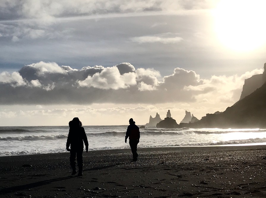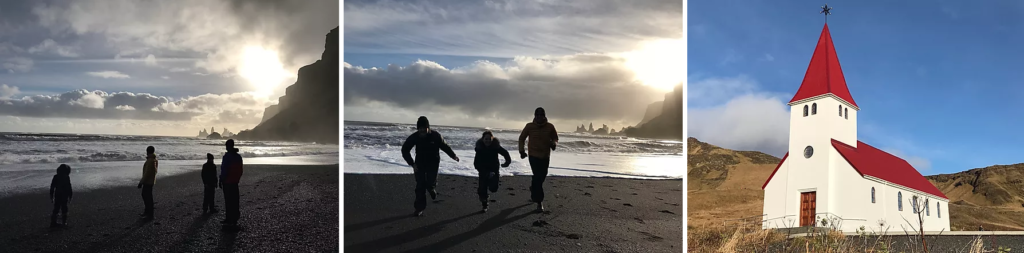 Dagens sydligste stop gjorde vi i den lille by Vik, der bl.a. er kendt for sin smukke kirke (som i sommermånederne er omgivet af lilla lupinmarker) og stenformationerne langs den sorte lavastrand. Det er underligt at forestille sig, at det om sommeren faktisk er en badestrand, når man på sådan en solbeskinnet oktoberdag oplever Atlanterhavet fascinerende vildskab og vinden der nærmest æder hele ansigtet. Det siges, at man skal være påpasselig her, og at havet gennem årene har taget en del mennesker med sig tilbage. Så vi blev i sikker afstand og besigtigede de smukke stenformationer, som skimtes i baggrunden til højre.