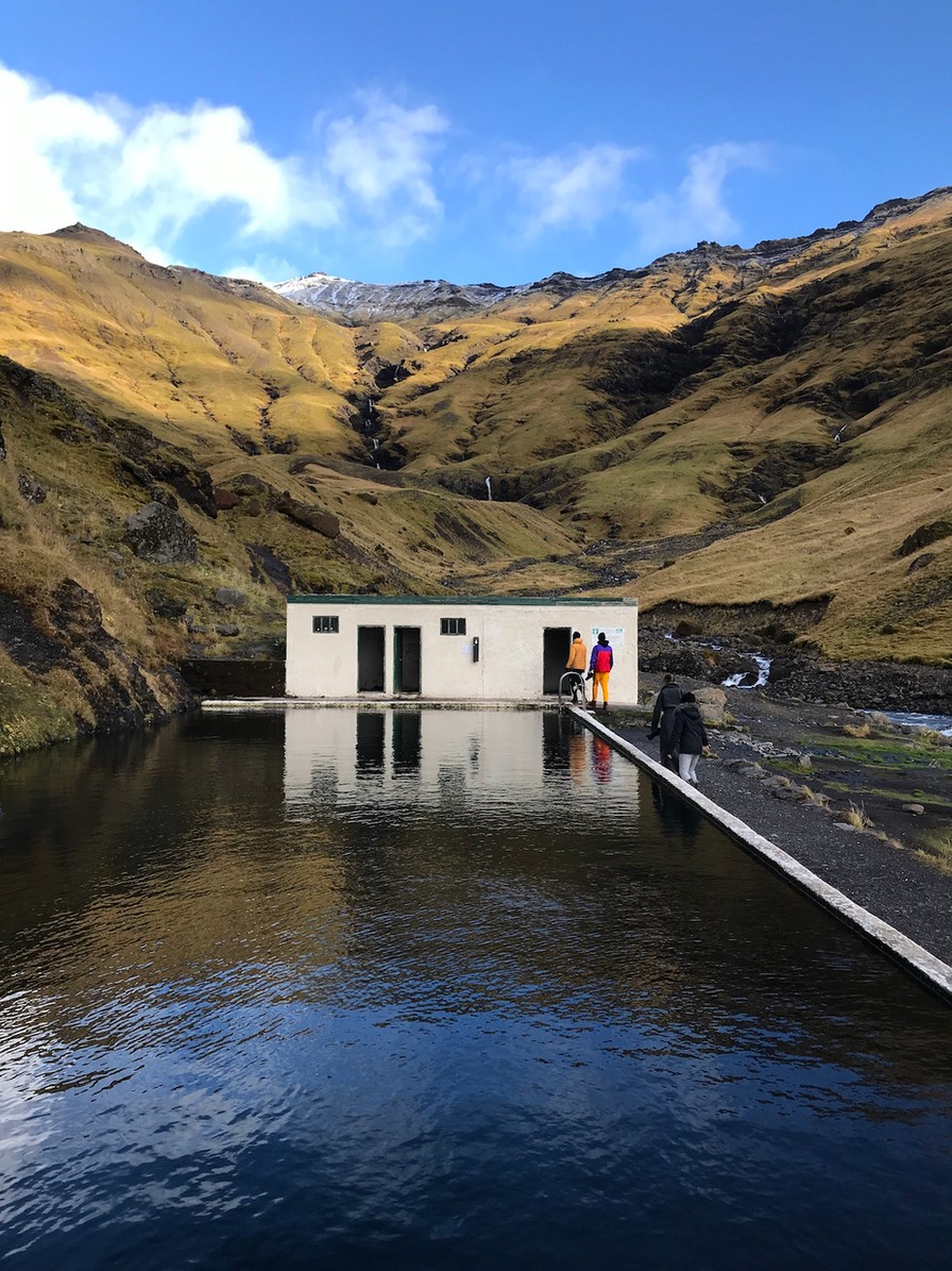 Laug betyder pool. Og med gårsdagens højdepunkt af en badetur i den varme kilde Hrunalaug, var alle mere en opsatte på en hikingtur gennem det islandske landskab for at finde den gemte pool Seljavallalaug. Bilen skiftede til 4-hjulstræk da vejens underlag skiftede, og den tog sig smukt gennem landskabet, til vi fandt et par andre parkerede biler. Herfra spottede vi en lille sti og begav os ind mellem bjergene. Heldigvis mødte vi et par modgående der kunne bekræfte at vi var på rette vej, for ellers er jeg ikke sikker på, vi var fortsat. Her var hverken signal på mobilen eller skilte til at guide os. “I skal bare krydse foss’en længere fremme, og så er I der“.