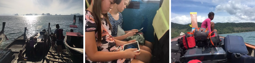 Vi startede turen med en lille båd fra en af de mindre moler på Noi. Herfra ca. 40 minutter til byen Thalen på fastlandet og derefter tværs over landet til Krabi færgehaven. En tur der efter sigende skulle tage en time, men vores tog 35 min. De har altså ofte en pæn tung fod på pedalen her i landet, når det kommer til bilkørsel. Derefter på den lidt større færge mod Koh Lanta, hvor vi blev sat af halvvejs og sejlet direkte ind til hotellet med deres longtailbåd. I alt tog det 5 timer hvoraf et par af dem gik med ventetid ved færgehavnen.