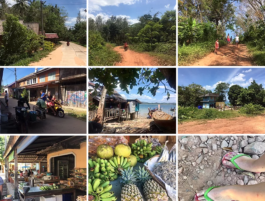 Som altid når vi kommet et nyt sted, hungrer vi efter at fået et kort i hånden og udforske området. Det er underligt at blive sat af fra vandsiden, og derfor ingen ide have om, hvor vi er havnet. Men allerede på en kort gåtur henad standen kunne vi tydeligt fornemme at Kom Jum er ganske anderledes fra Koh Yao Noi. Noget mindre også. Og endnu mindre befolket og turistet, hvilket jeg næsten ikke troede var muligt. Dagen i dag har stået på rundtur med scooter. Og allerede kort fra hotellet var det helt tydeligt at øen er noget mere ufremkommelig en Noi. Det lader ikke til at google maps har været forbi, for vores gps i telefonen viser ingen veje overhovedet, så vi kørte bare på må og få og et håndtegnet kort, der lader til at være det eneste over øen. Øen er godt og vel 12 km. lang fra nord til sydspids, og her er kun 1.500 fastboende