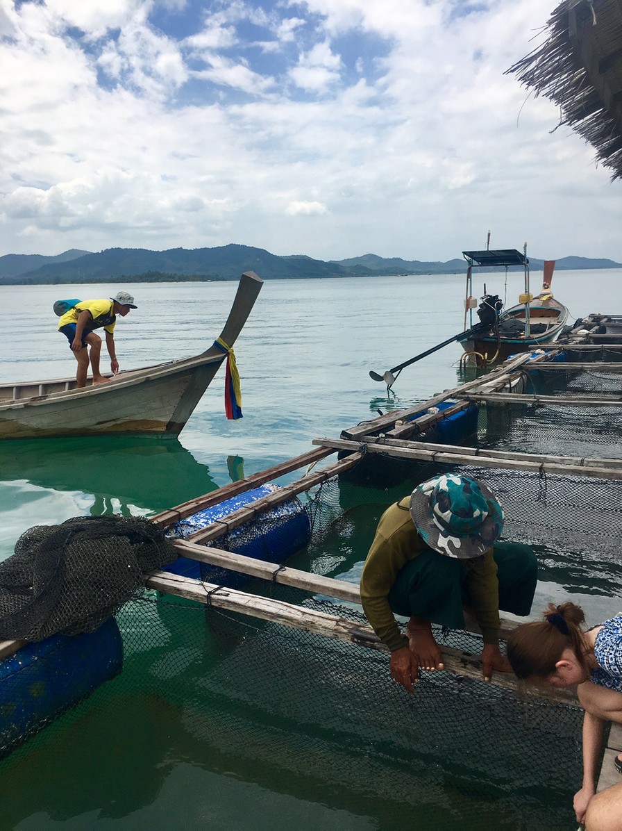 På vores rundtur i dag kom vi forbi en mole, hvor vi havde opsnappet, at man kunne sejle med de lokale fiskere ud til små fiskefarme. Vi spurgte os frem og fik kontakt til en lokal fisker, og 5 min efter var vi på vej i hans lille long-tail båd ud til en masse små bassiner af alskens fisk, krabber, hummere og hajer, hvilket senere skulle vise sig, at være mere end en supergod ide.