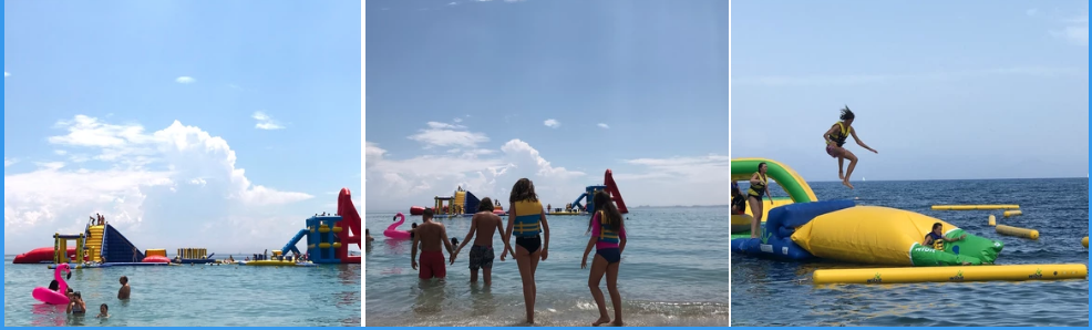 Vi har fundet disse 2 forhindringsbaner ved standene i hhv. Ipsos og Benitses. Begge steder kan man få udleveret redningsveste. I Benitses er dette påkrævet. Selvom vores børn alle er habile svømmere, er vi altid en voksen med ude, selvom der også er livredder på området.