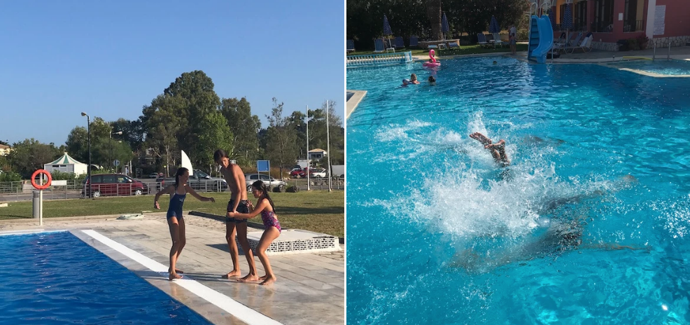 Derudover bader vi ofte ved en stor pool i Gouvia Marina, hvor mange af bådejerne lægger til og tager en pause fra sejlturen. Børnene synes det er sjovt at bade i forskellige pools – gerne store og dybe, så der kan laves udspring af alle arter.