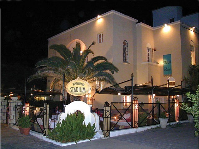 I samme retning – på vej fra havnen mod lystbådehavnen på strandpromenaden – dukker restauranten Stadium op på højre hånd (ikke vandsiden). Her er SÅ hyggeligt og god stemning, og vi kom der rigtig meget de 3 sommersæsoner, vi boede på øen. Den var valget, når vi indimellem fik cravings for noget andet end græsk mad, og derfor kommer den med som mit bud på et sted, hvor man kan spise god mad fra det internationale køkken with a twist of Greece:-)