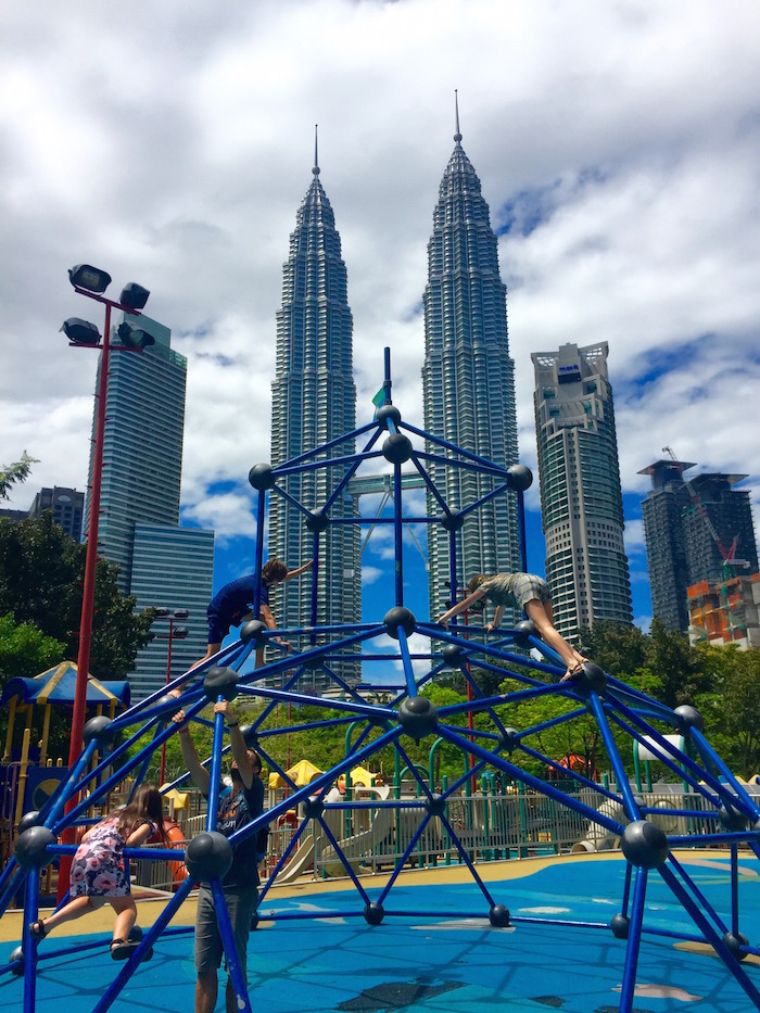 Og så selvfølgelig KLCC som en park omkring Twin Towers (som til dato endnu er verdens højeste tvillingetårne på godt 450 m). I parken er en gigantisk legeplads hvor der bl.a. er et stort shoppebassin, hvor vi lige fik dyppet fødderne.