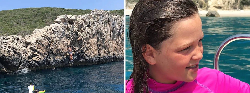 ved en strand sejlede der en lille båd rundt og solgte sodavand, is og kaffe, så vi fik en is, og mine forældre fik kaffe. Vi sejlede videre. Så kom vi til en klippe hvor man både kunne hoppe fra et lavt stykke og et meget højt stykke. Min søster Camille hoppede far cirka 1 til 2 meter, og min bror Rasmus hoppede far cirka 10 meter. Jeg turde ikke, og min far kunne ikke hoppe fordi han skulle styre båden fordi vi ikke lage anger. Vi fik hurtigt tiden til at gå, så vi havde haft båden i ret lang tid.