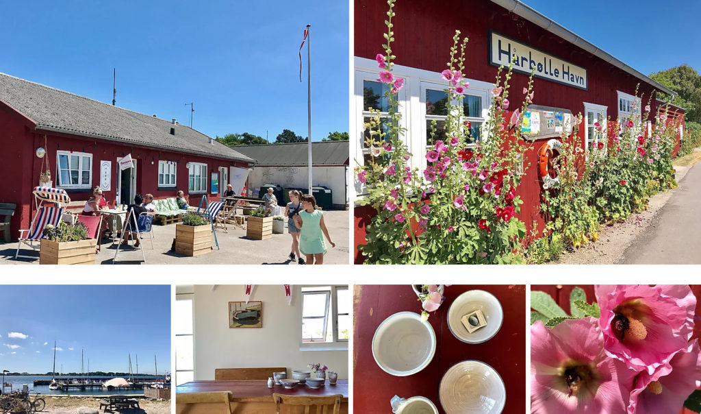 På vej mod havnen glædes man over det fine gamle røde hus, hvor stokroser overlegent slynger sig op ad stort set alle de ledige pladser, de kan finde. Og lige rundt om hjørnet finder du Hårbølle Havne Høker. En fin cafe, der er præcis ligeså uhøjtidelig og hyggeligt, som den er skøn. Her føler man sig tilrette med det samme, og man får lyst at slænge sig i en liggestol eller i den fine palmestofbetrukne pallesofa. Vi var tidligt på færde, og fik en virkelig dejlig kop kaffe i solen, og pigerne en is med håndpisket flødeskum og Arlettes hjemmelavede rabarbersyltetøj på toppen. Mums! Der er masser af luft og plads til både skønne gåture og en dukkert på stranden lige til højre for høkeren. Eller du kan låne et fiskenet og fange krabber fra molen.