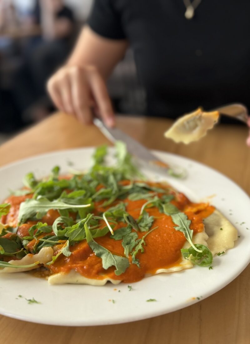 Da vores eneste aften i byen gik med koncert, var vi kun ude og spise til frokost. Første dag spiste vi virkelig lækker mad på Prinz Myshkin, som er en vegetarrestaurant med et stort og varieret menukort. Vi fik bl.a. en trøffelravioli, som sad lige i skabet.