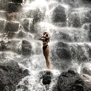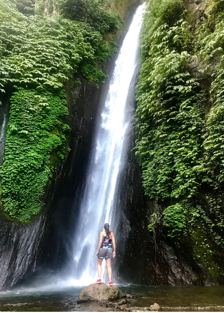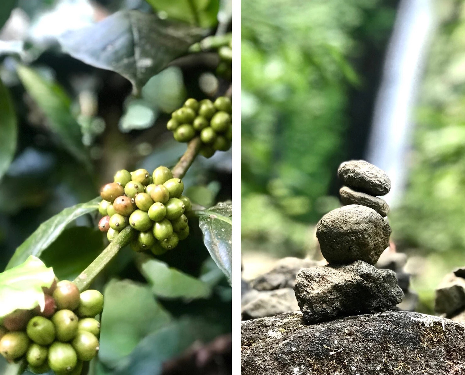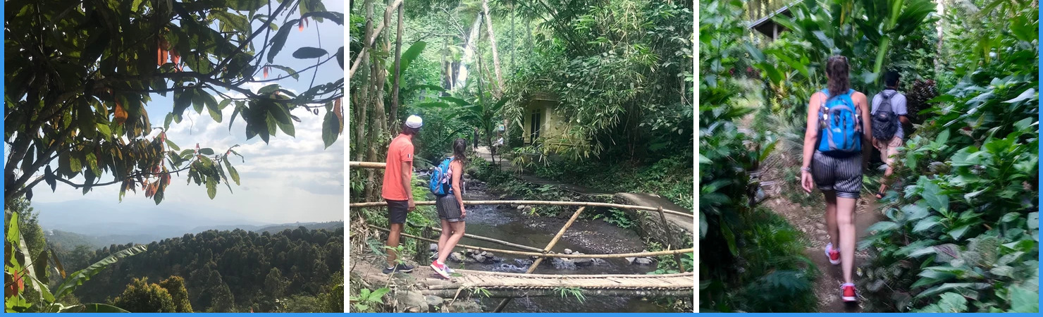 Turen varede 2 timer på små stier både af grus og sten, enkelte bambusbroer og en kortere strækning med kuperet og lidt usikkert terræn. Men absolut ikke sværere, end at hele familien havde kunnet klare den. På vejen kom vi forbi et flot 32 m vandfald og så et hav af planter og frugter, som vores guide fortalte om.