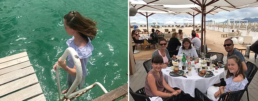 Øverst: Rue D’antibes – lidt shopping fra Zara blev der råd til:-) Nederst: Sjældent foto af os alle. Frokost på La Plage (tartare et frites og burgers) og et tå-dyp fra deres badebro.
