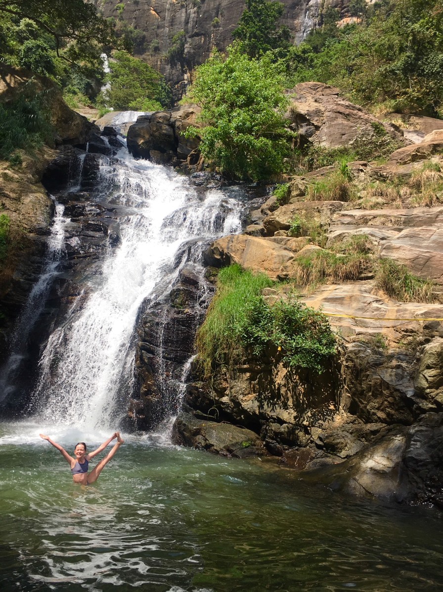 Et kort smut i tuk-tuk fra byen kan man bade (hvis man er modig som Camille) i det smukkeste vandfald. Udspringet er imponerende flot og her kommer lokale også og tager sig et bad. Vi andre holdt os pænt på klipperne.