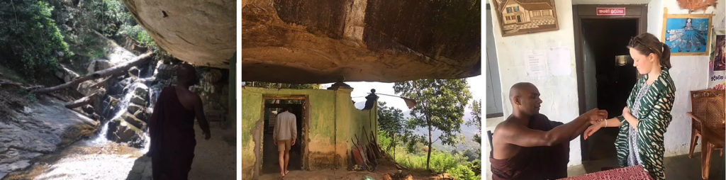 Kort efter vandfaldet besøgte vi et lille grotte tempel, hvor 5 munke bor og underviser i meditation. Her kommer både turister og lokale og bor i meget simple grottehuler i kortere eller længere perioder. Vi fik en længere rundvisning, og stedet havde en storslået udsigt. Han talte og fortalte i en lang indlært køre, som vi desværre stort set intet forstod af. Til sidst sang han en længere sang for os og velsignede os med bøn og armbånd. Absolut et fint besøg, selvom vi ikke forstod så meget af det, han fortalte.