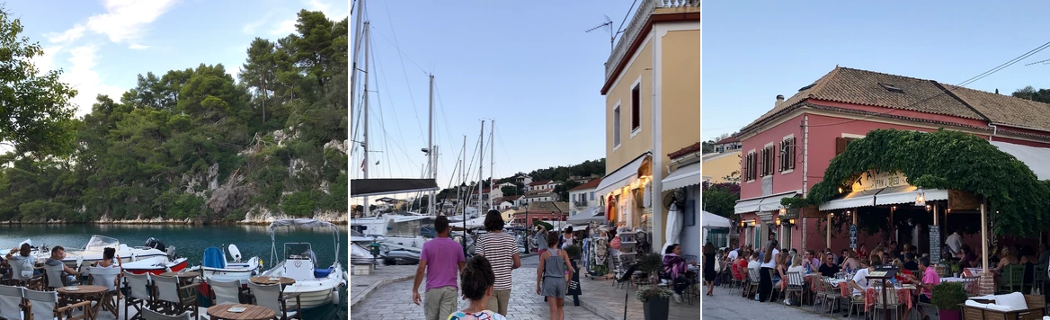 Hver dag kommer der mange fyldte turistbåde fra Korfu til byen. De ligger til i nogle timer både i hovedbyen Gaios, nordbyen Lakka og på Antiparos, og der er et liv og leben og ret mange mennesker alle steder. Men når klokken bliver ca. 16, og de sidste turbåde har forladt øen, mærker man for alvor byens rigtige atmosfære. Her er stille summen, ro og fed og masser af plads alle steder. Det er virkelig anbefalelsesværdigt at tage en overnatning eller to, da man efter min mening ellers ikke får den rigtige stemning med.