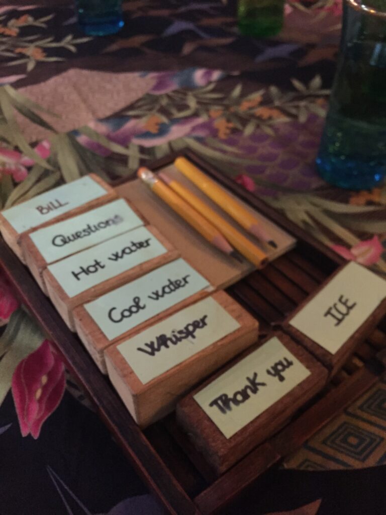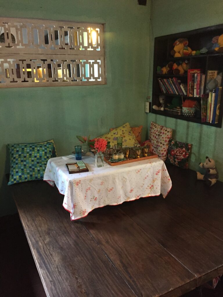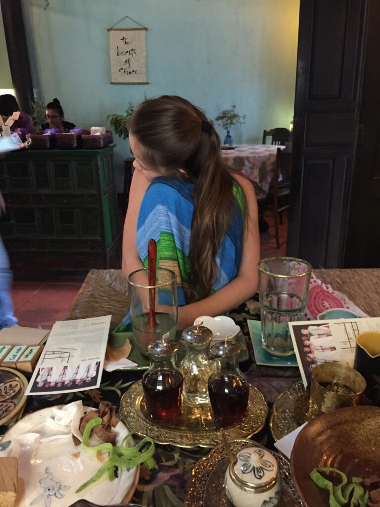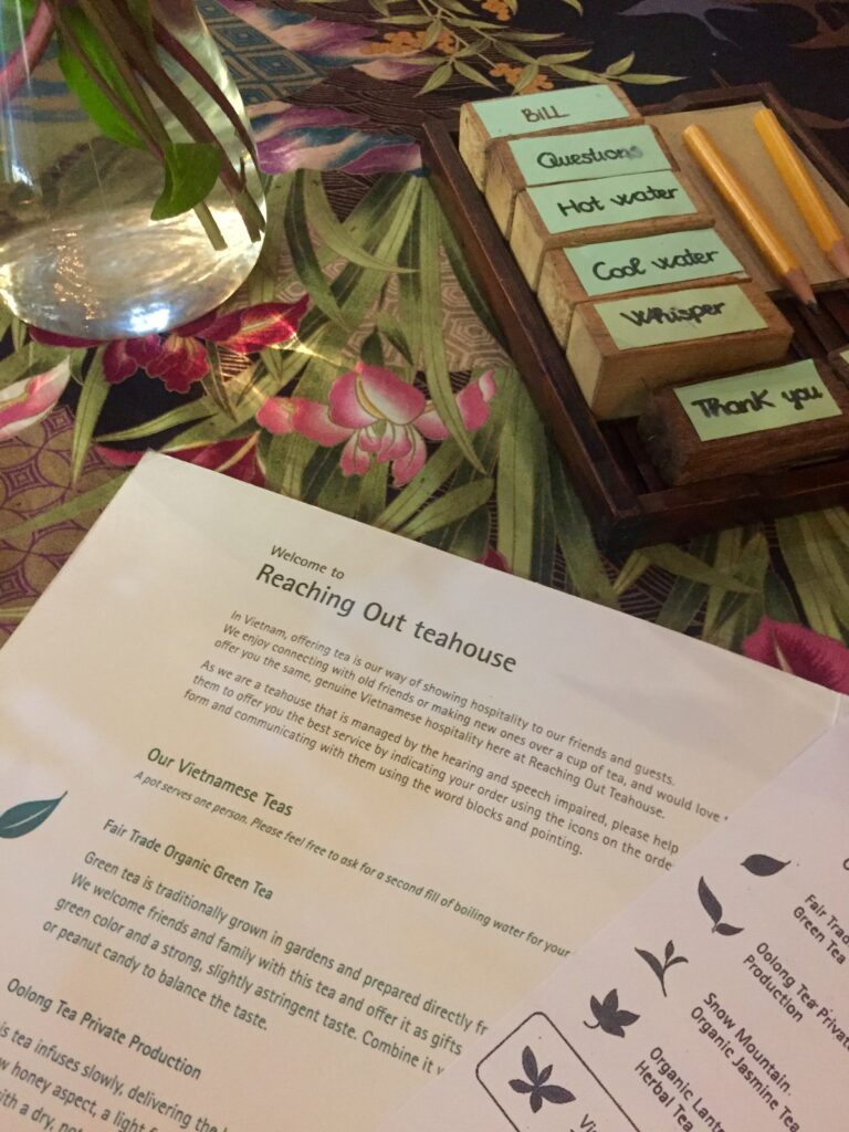 Sådan står der på væggen i det fineste gamle thehus “Reaching out teahouse” i centrum af Hoi An’s gamle bydel. Cafeen er baseret på et socioøkonomisk koncept, der arbejder for bedre vilkår for fysisk og psykisk handicappede gennem at skabe værdi- og meningsfydte jobs. Cafeen er drevet af, og betjenes alene af døvstumme, og er i den grad en oplevelse ud over det sædvanlige – det mærker man straks, man træder ind. Der er stille og alle gæster taler meget sagte. The og fine hjemmelavede småkager i alskens varianter serveres i de smukkeste forskellige stel og keramik.