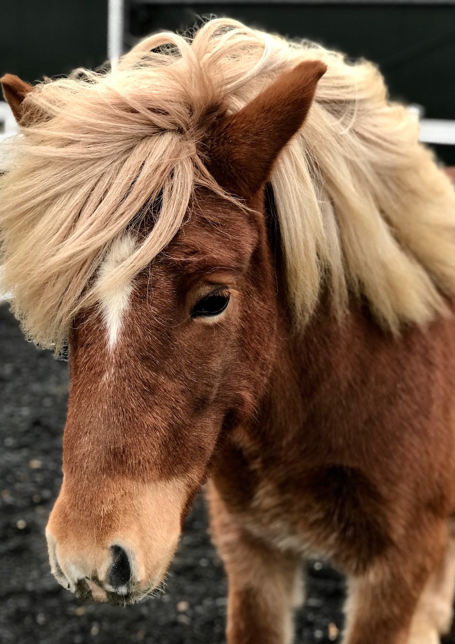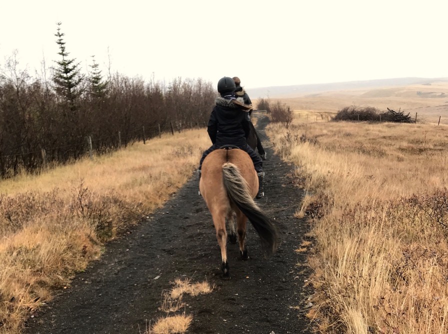 Rideturen gik over marker og stier af divergerende kvalitet cirka 1 times tid. Med på turen havde vi 2 søde guider. En hollandsk og en tysk pige, der har arbejde på farmen 6 måneder og hjælper til med at passe heste og ride turistture. Det særlige ved de islandske heste er, at de har flere gangarter end andre hesteracer. Særlig kendte er de for gangarten Tölt, og mange af dem har desuden arten Flying pace (pas gang). Det blæste for meget til at tölte udenfor (vist mest fordi der var en begynder som mig med!), så da vi var retur i læ i ridehallen gik det løs med tölt for resten af holdet. Der var udpræget begejstring, og meldingen fra hesteryggen var, at gangarten er noget mere komfortabel end trav.