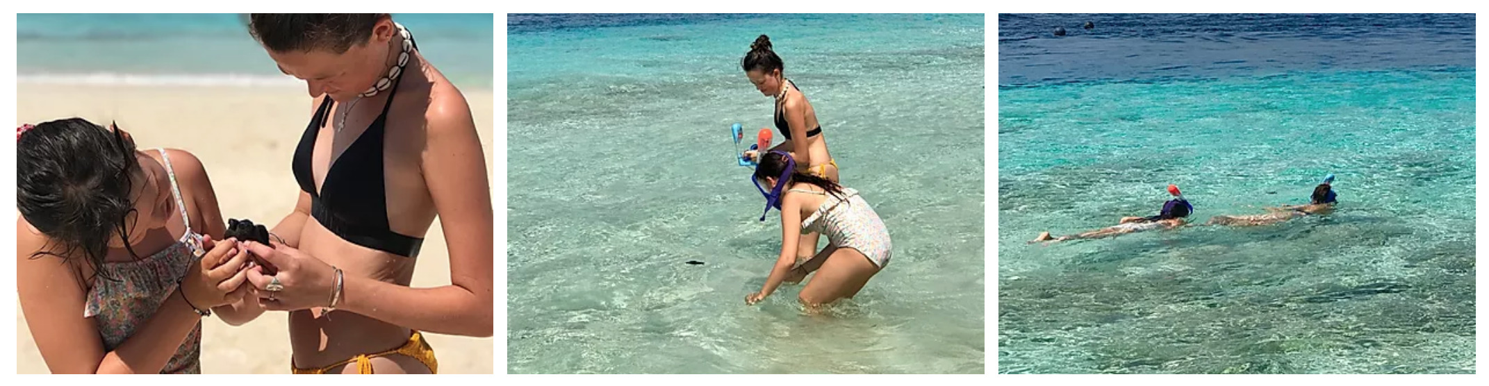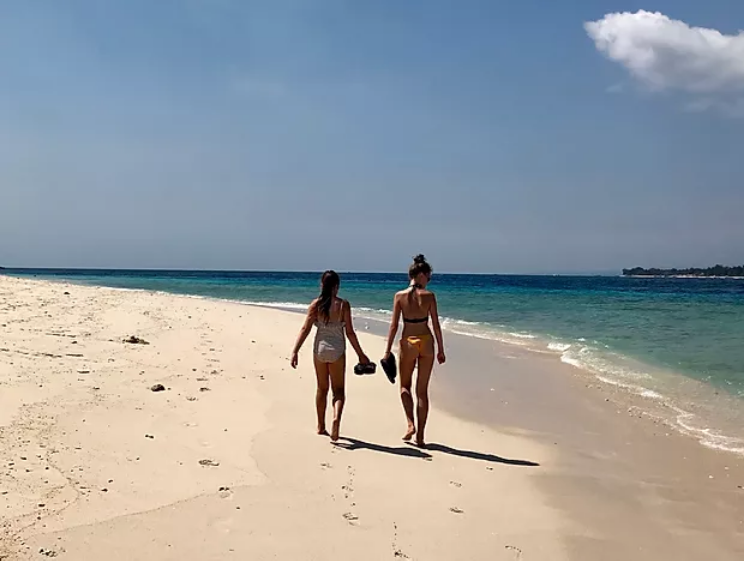 Lige nu er vi her på Gili Meno. Her skal vi også være i tre dage. I går kom vi hertil, og der startede vi bare med at bade i vores rigtige lækre pool, på vores rigtig lækre hotel. Vi har gået hele øen rundt, og der er kun 5,1 km rundt om hele øen. Vi har været ved de lækreste strande. Og Camille, Mor og jeg har samlet en hel masse muslinger. Men det er mest min mor og Camille der gider blive ved.
