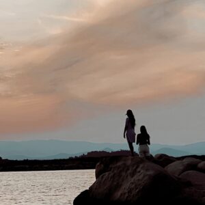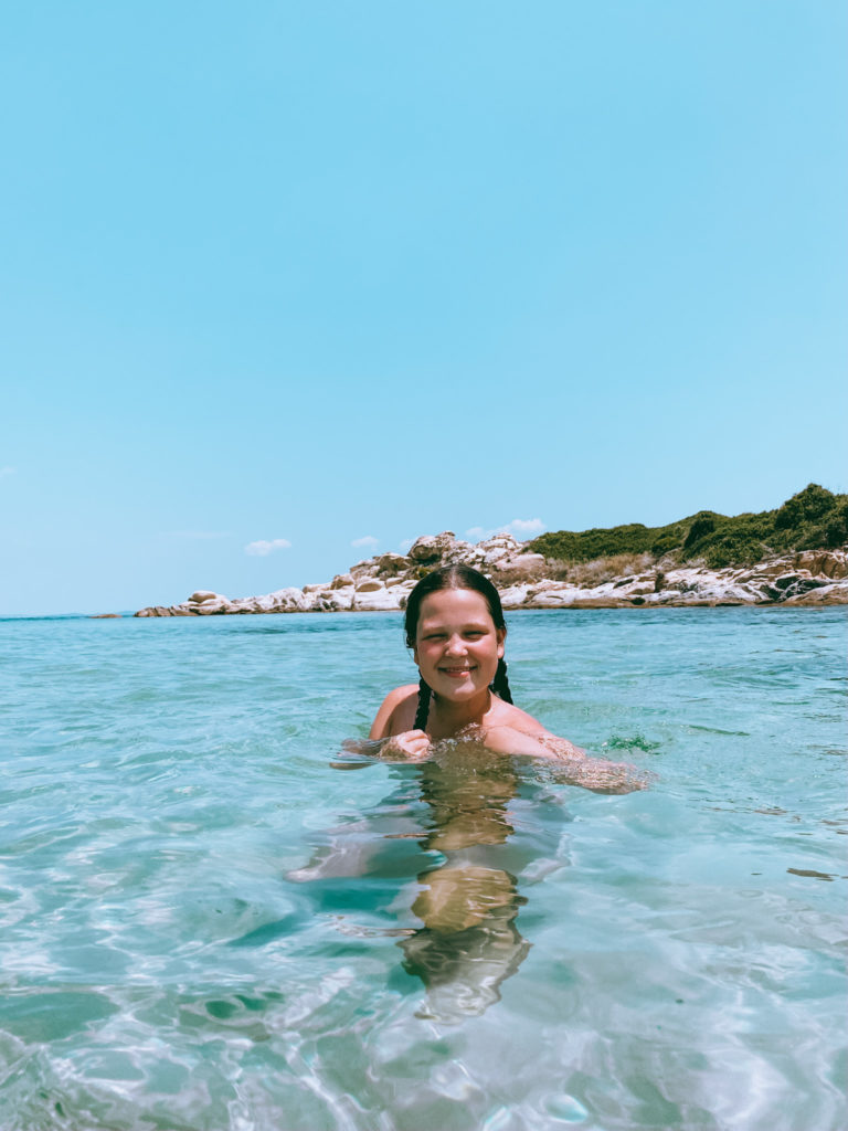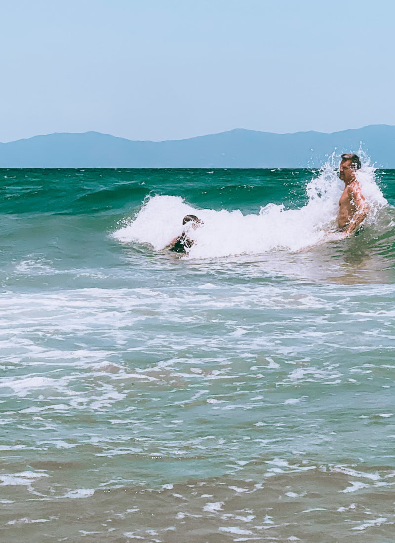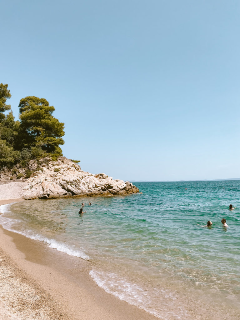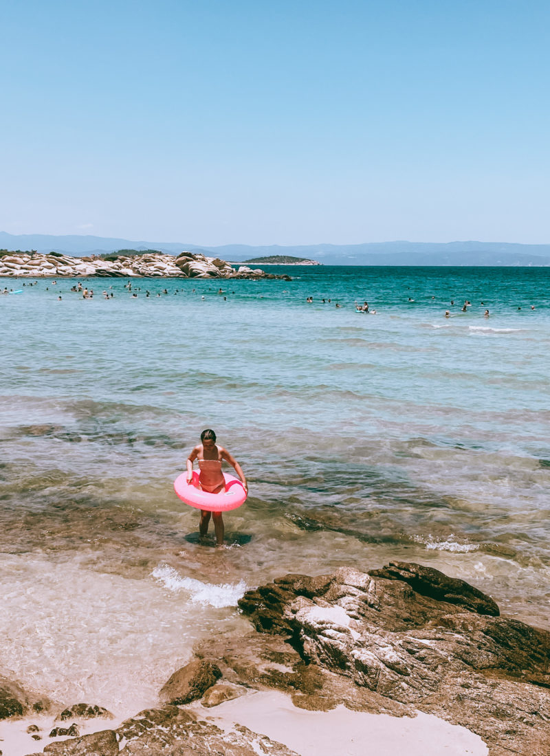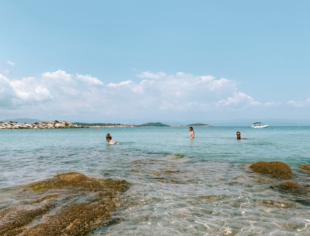Fra denne del af øen, bader man med udsigt til Mount Athos på den anden ø (ses i baggrunden) og da vi besøgte stranden var der godt liv i vandet til Selma og Jørgens store fornøjelse.