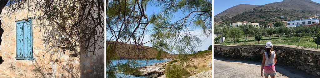 Vi bor i en lille malerisk fiskerby Kini Bay, som ligger på øens vestside. Helt perfekt for solnedgangen, som vi kan se fra vores terrasse. Byen er ganske lille. Huser 6-7 tavernaer langs stranden som danner rammen om byens midte. Længst til højre holder de små fine fiskerbåde til. Her er så stille og roligt, som man kun kan drømme om, når man ankommer efter 2 dage i Cirkus-Mykonos. I dag vågnede vi af byens kirkeklokker. Også her bor vi helt på toppen af bugten, så det bliver også til trapper og og ned, dog i meget mindre grad en på Mykonos.