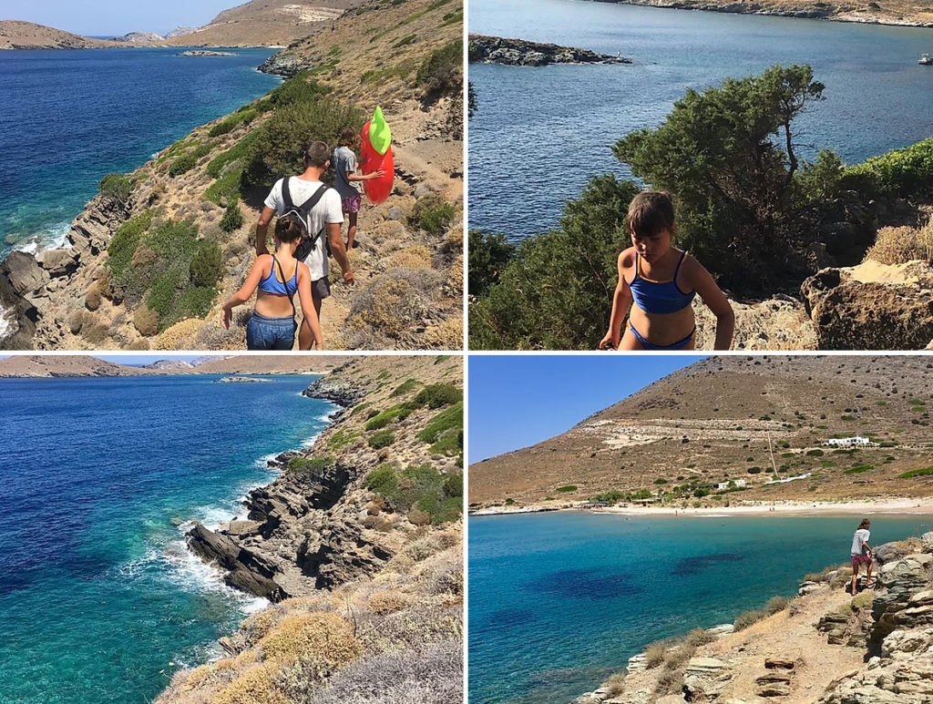 I dag begav vi os ud på et 40 min. hike til Delfini beach, som ligger lidt nord for Kini. Det var den fineste tur, som dog nok havde været en smule nemmere fremkommelig, hvis ikke det var fordi, vi i bedste turiststil valgte at medbringe et kæmpe badedyr i form af et jordbær på 1,2 x 1 m. Men nu var det indkøbt og så skulle det med. Lidt sjovt så det altså ud, som vi kom slendende der i den fineste natur med et kæmpe plastikjordbær og i klipklappere – totalt turister:-) Turen var virkelig fin og stranden vi kom frem til var hele turen værd. Nogle steder skulle man ”klatre” ganske lidt. Men udsigten og alle duftene af de omkringvoksende krydderurter var helt unik. Særligt salvie og timian vokser der meget af.