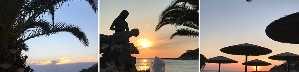 Når man er heldig at bo på øens vestside medfølger også muligheden for fine solnedgange. Dem er vi ikke blevet snydt for. Byen har sin helt egen havfrue, som lader til at have reddet en såret sømand (eller noget). Her ses de smukt i solnedgangen – husk at klikke for at se dem i højformat.