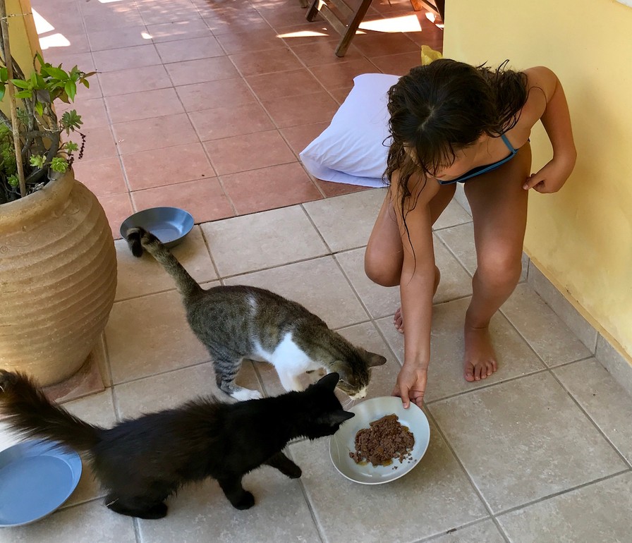Alle steder vi er får jeg nogle dyrevenner. Her på Korfu har jeg 3 kattevenner. Den sorte hedder Alfred, den grå hedder Jack, og den lyse hedder Samson. Jeg ved ikke hvad de rigtig hedder, så jeg har bare selv givet dem navne. Jeg kan bedst lide Jack, og det er fordi sidste gang vi ver her var han der faktisk også. Jack har kun et øje, men han er den sødeste huskat. Vi giver kattene mad flere gange om dagen. Når vi kke er her giver personalet dem mad, de har også givet os mad skåle så vi kan give dem mad i de skåle. Da vi kom fra lufthavnen om natten ventede Jack på os, men vi tror ikke at han kunne huske os fordi det er 3 år siden.