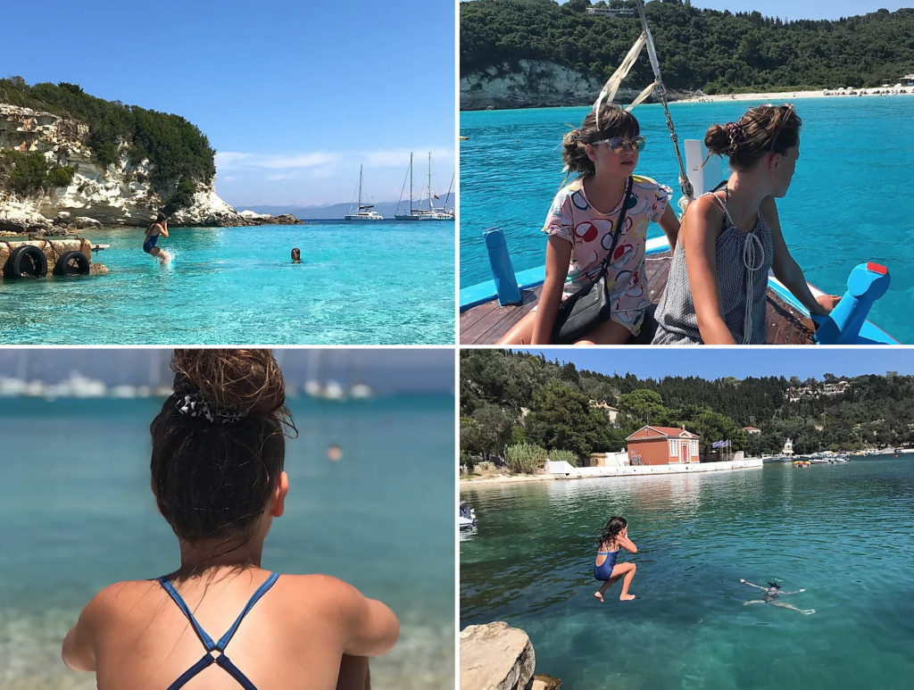 1) På stranden var der en lille bro man kunne hoppe i fra, der var ikke så dybt 2) Vi sejlede ud til øen AntiPaxos med en lille båd.