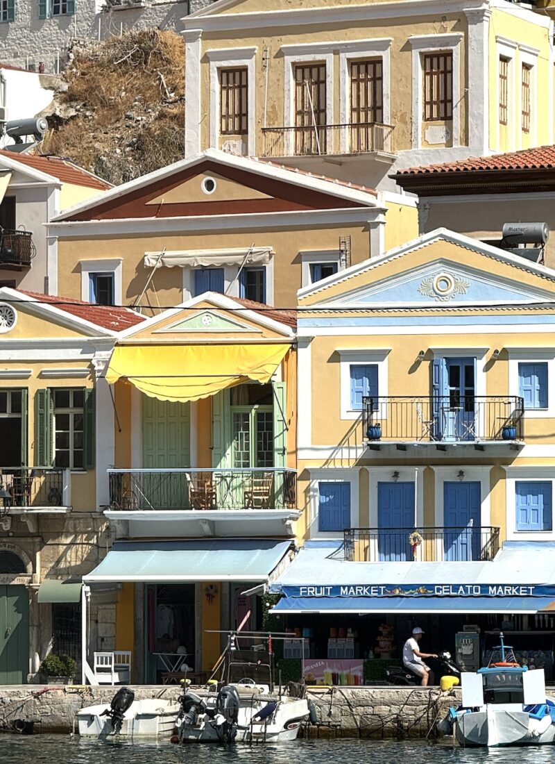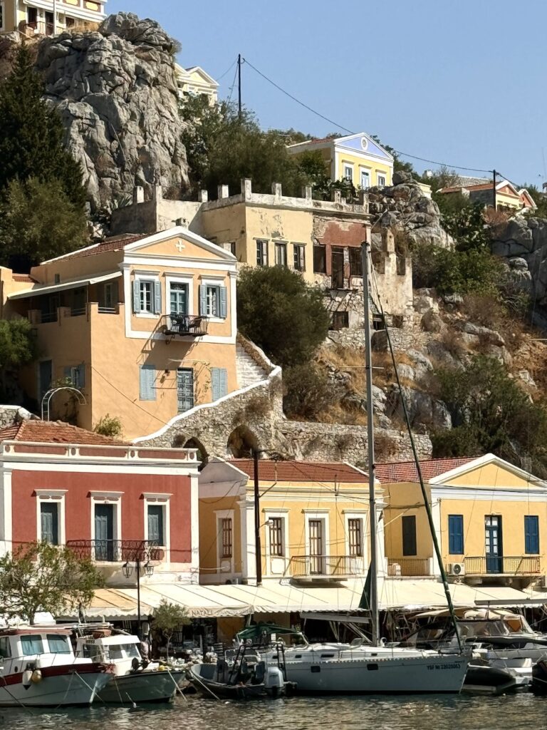 Hovedbyen hedder Gialos, og er der man kommer ind med færgen. Den er helt utrolig smuk og velholdt, og minder lidt om Giaos på Paxos og ellers minder den nok mest om Loulis på Kea. Begge dele steder vi var ret begejstrede for, så det ligger nok ret godt i tråd med følelsen omkring Symi.