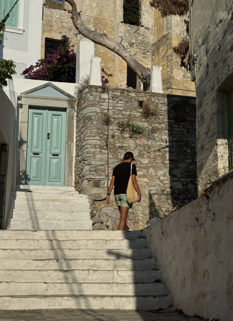 For at tage os fra Pedi bay, hvor vi bor, til Gialos, går vi en smuk (semianstrengende og varm) tur op gennem byen, og videre ned på den anden side til næste bugt (tager ca. 35 min). Eller man kan køre med lokalbussen – ca. 15 min – den går hver halve time og koster 2,50 euro.