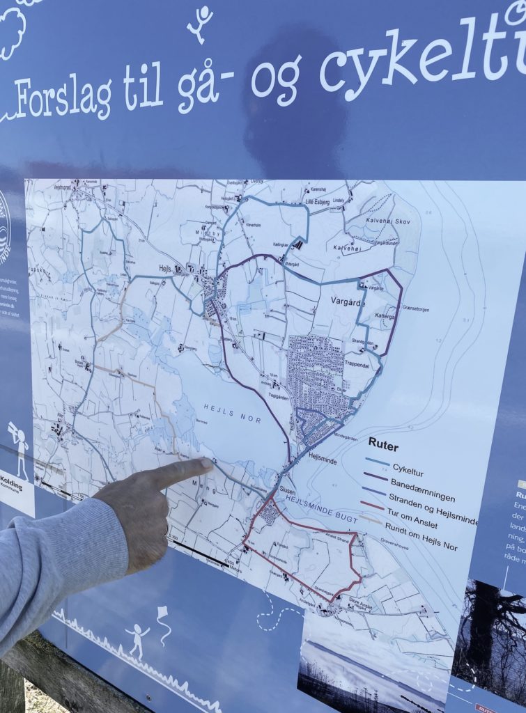 Sådan beskrives ruten på officiel vis ved siden af oversigtskortet, som du finder ved turens start ved havnen i Hejlsminde, hvor der også findes parkering.
