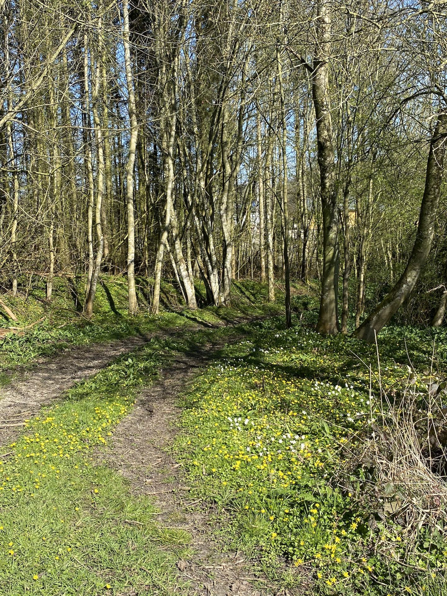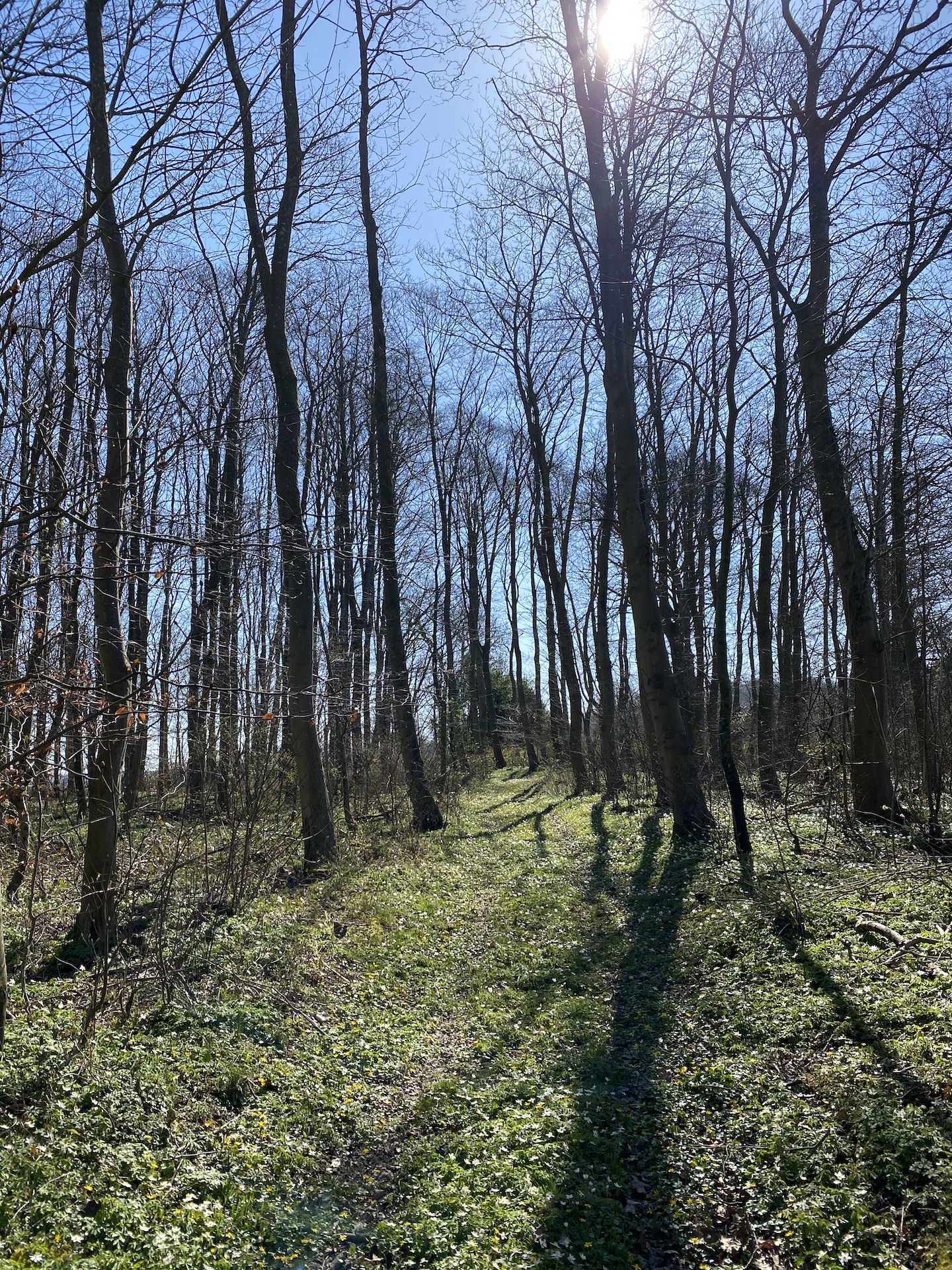Lige efter møllen ligger et smukt lille skovstykke, hvor skovbunden netop nu er dækket af den smukkeste dyne af hvide anemoner. Denne del er ikke et stykke af den officielle rute, men absolut en lille afstikker værd.